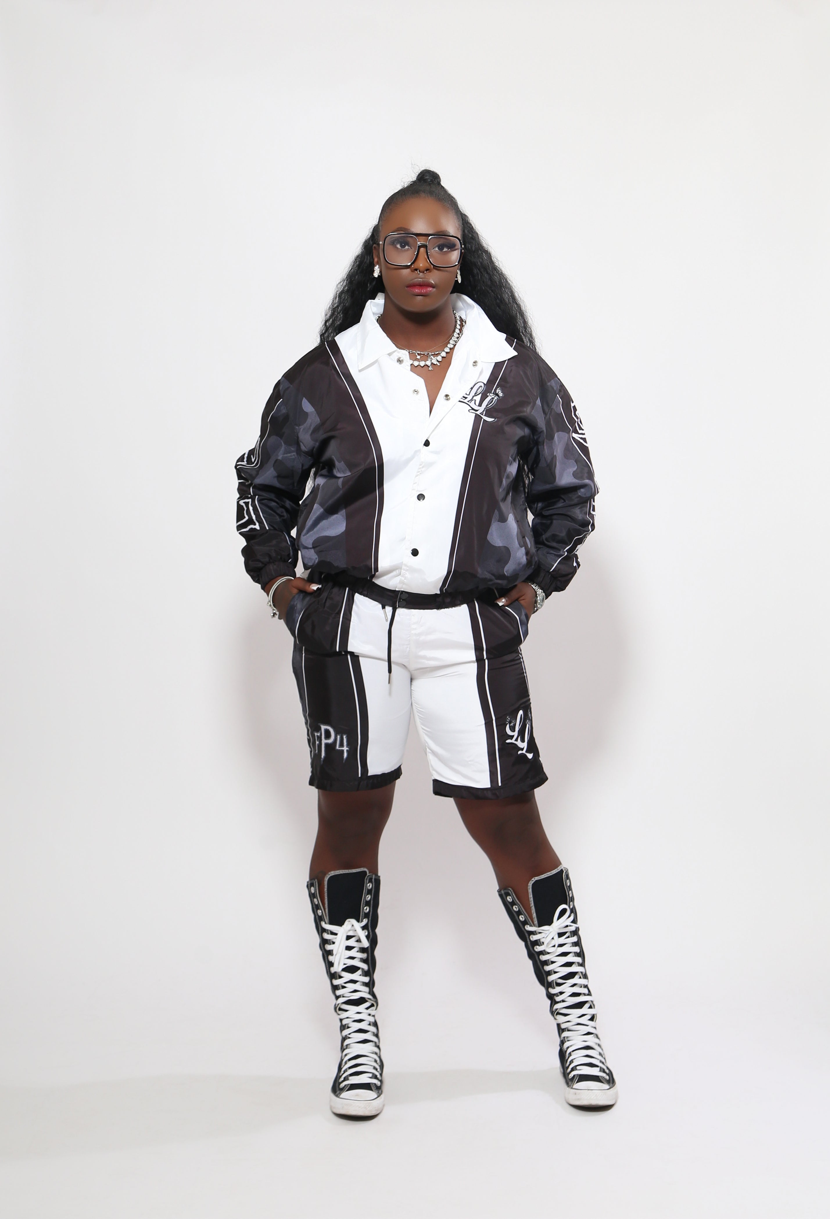 Bold black-and-white panel design with camo detailing on sleeves