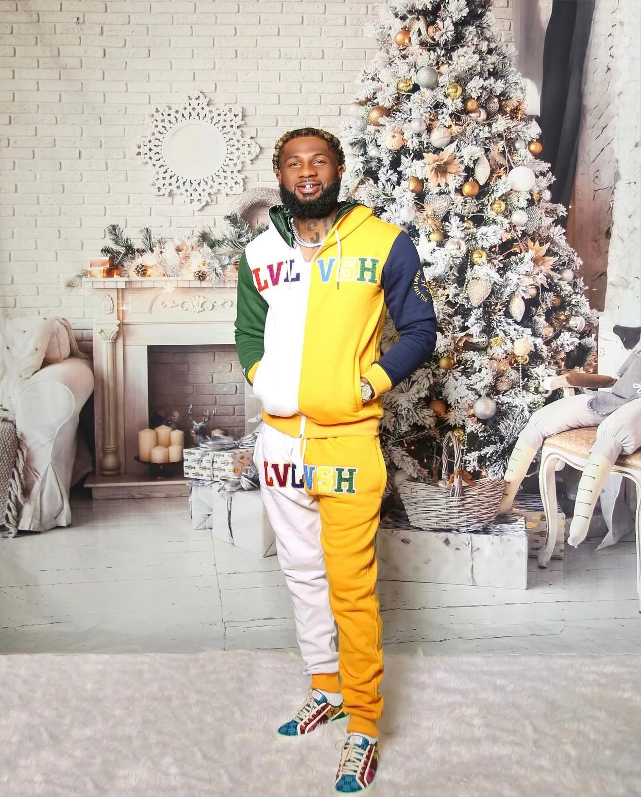 Custom LVLVSH varsity patch embroidery on chest and pants